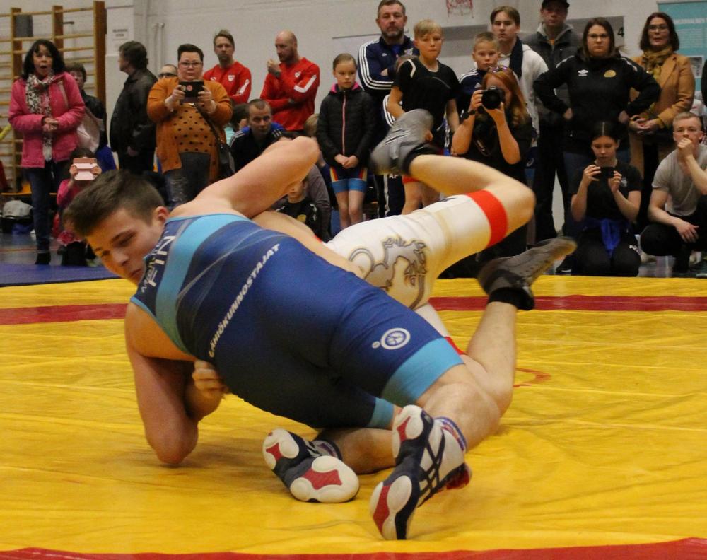 Luka Kemppaisen kulta tuli kahdella ylivoimaisella pistevoitolla. Ensin Lukan kivenkovat otteet sai kokea Muhoksen Voiton Eero Seväkivi ja toinenkin kovanonnen soturi nimeltään Vilho Schmitt oli Muhoksen voiton miehiä. Molemmat ottelut päättyivät 12:0 pistein ja molemmissa pisteet tulivat komeista takavyöheitoista, jotka eivät ole kovin yleisiä vielä näissä sarjoissa.